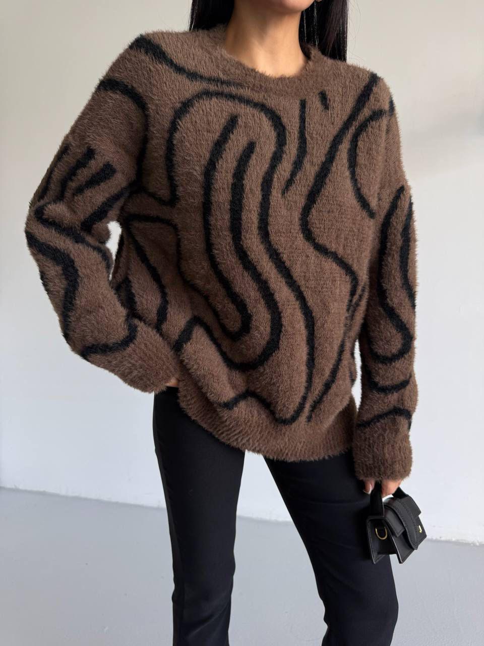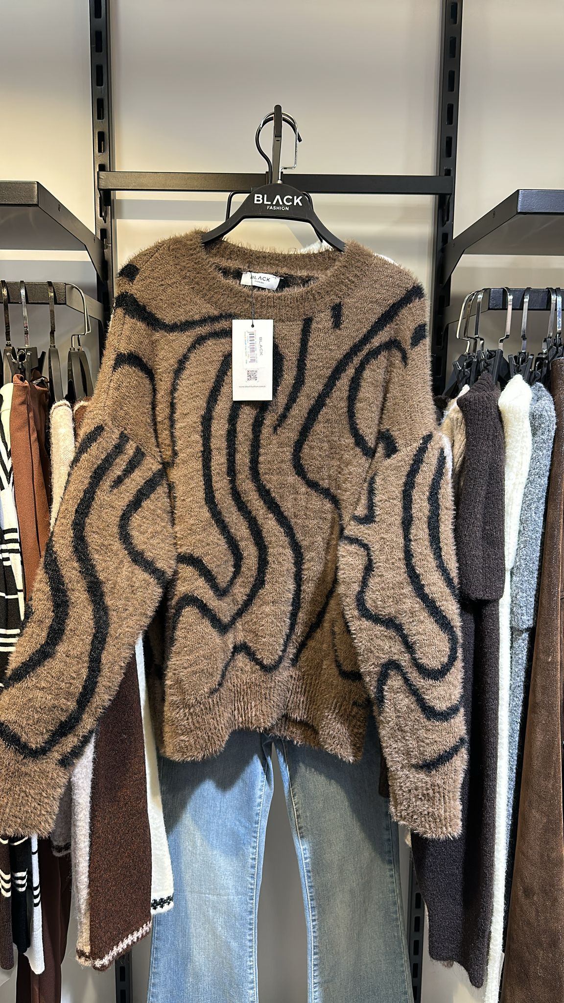 A soft mocha-toned fuzzy sweater featuring bold black abstract line details for a modern, artistic look. Cozy, stylish, and perfect for everyday wear.