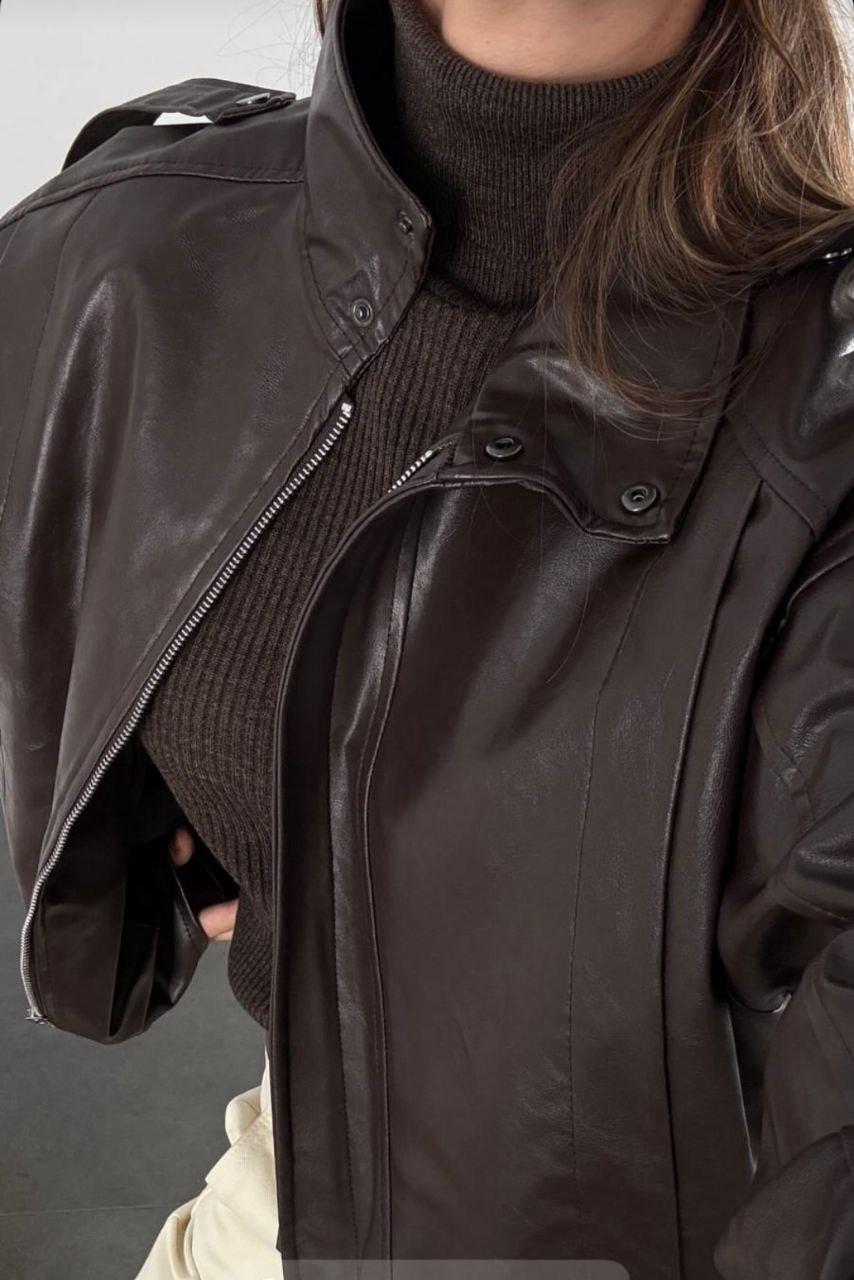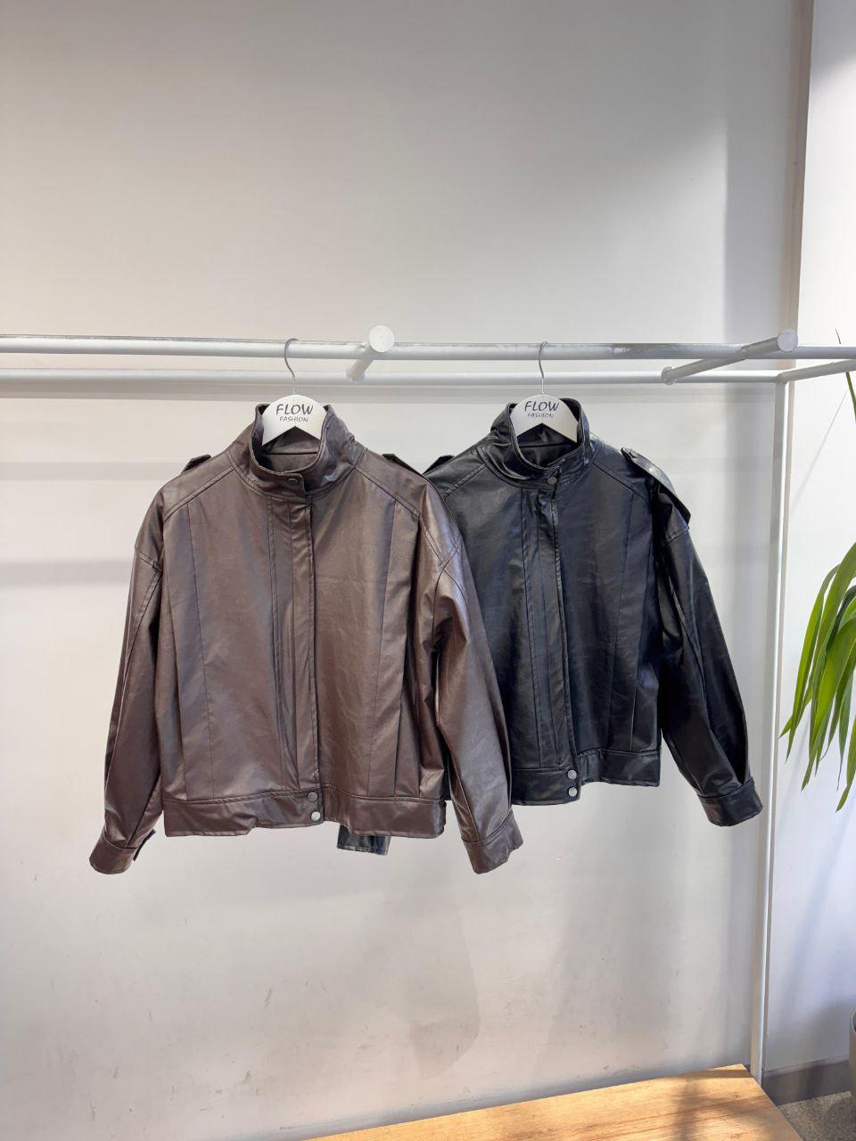 A sleek faux-leather jacket with a modern biker silhouette, minimalist details, and a clean stand collar — refined, bold, and effortlessly versatile.