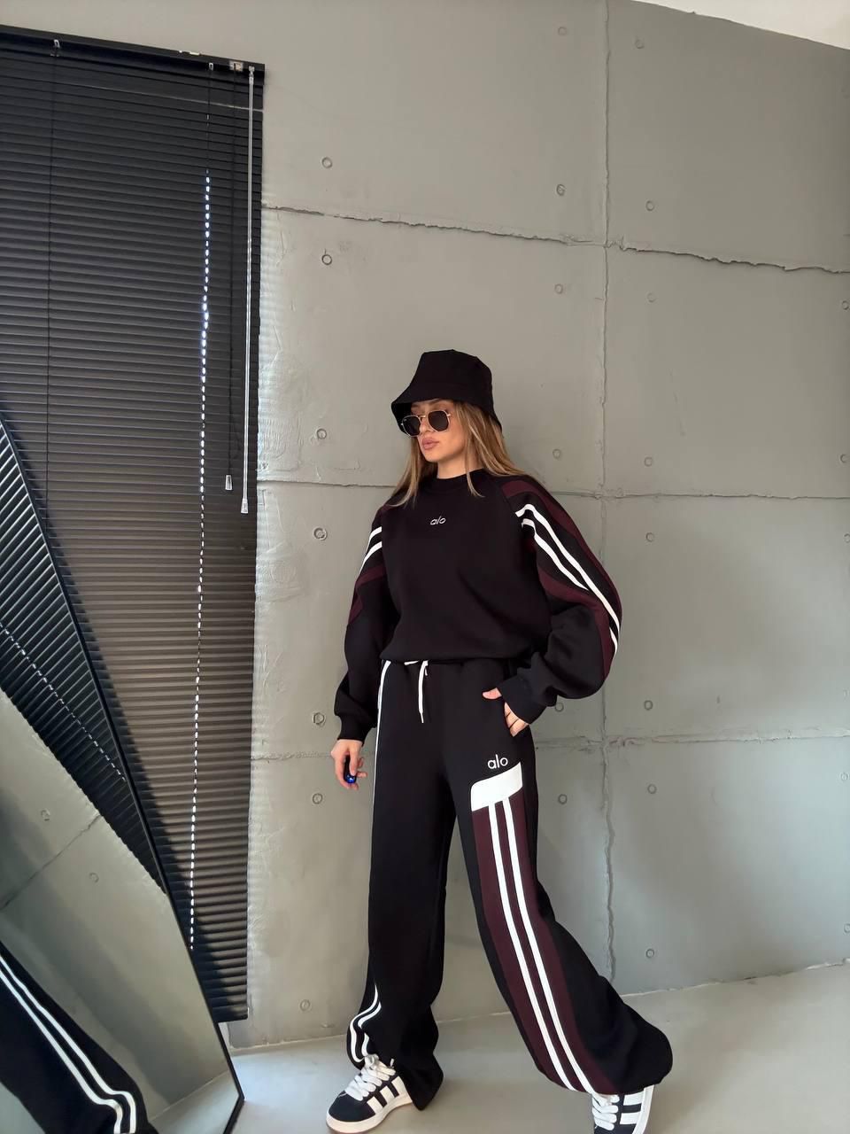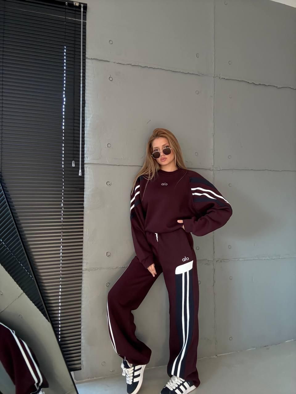 A contemporary athleisure set featuring a relaxed sweatshirt and high-waisted pants with contrast stripes — the perfect balance between sport and street style.