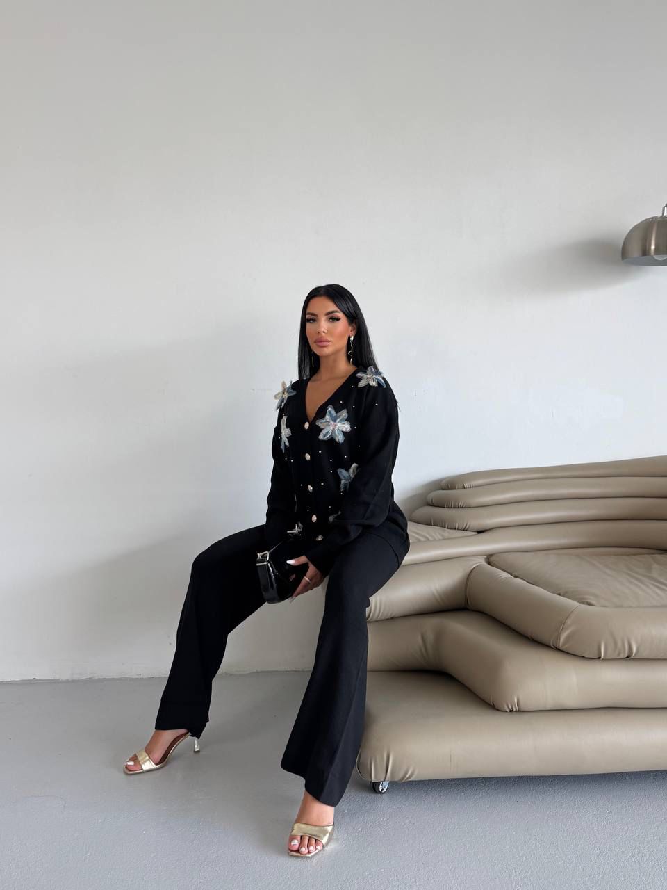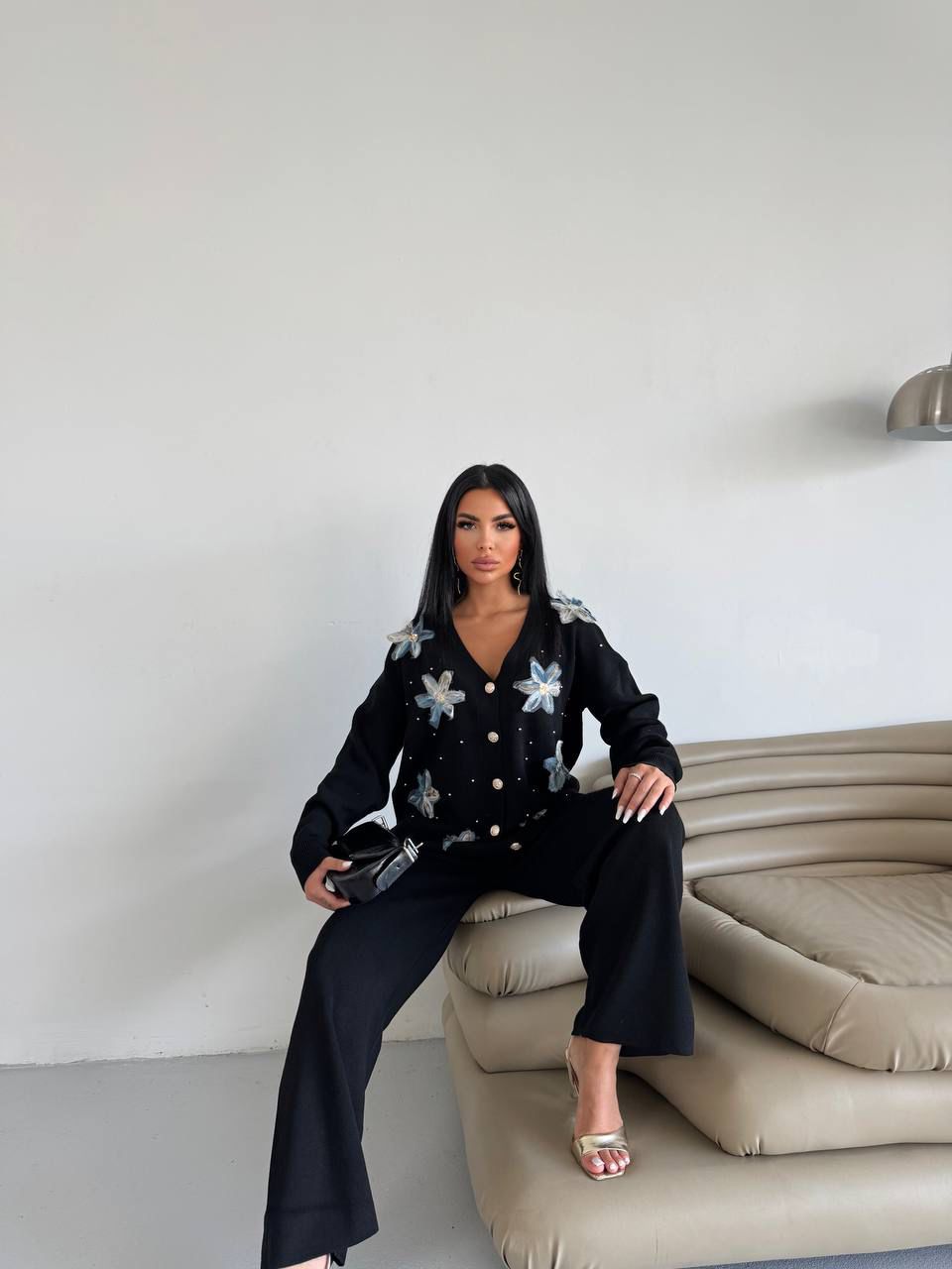 A soft knit set adorned with delicate 3D floral appliqués — a feminine expression of comfort and sophistication.