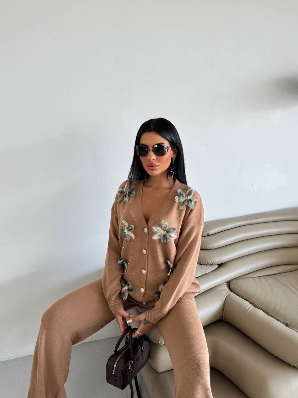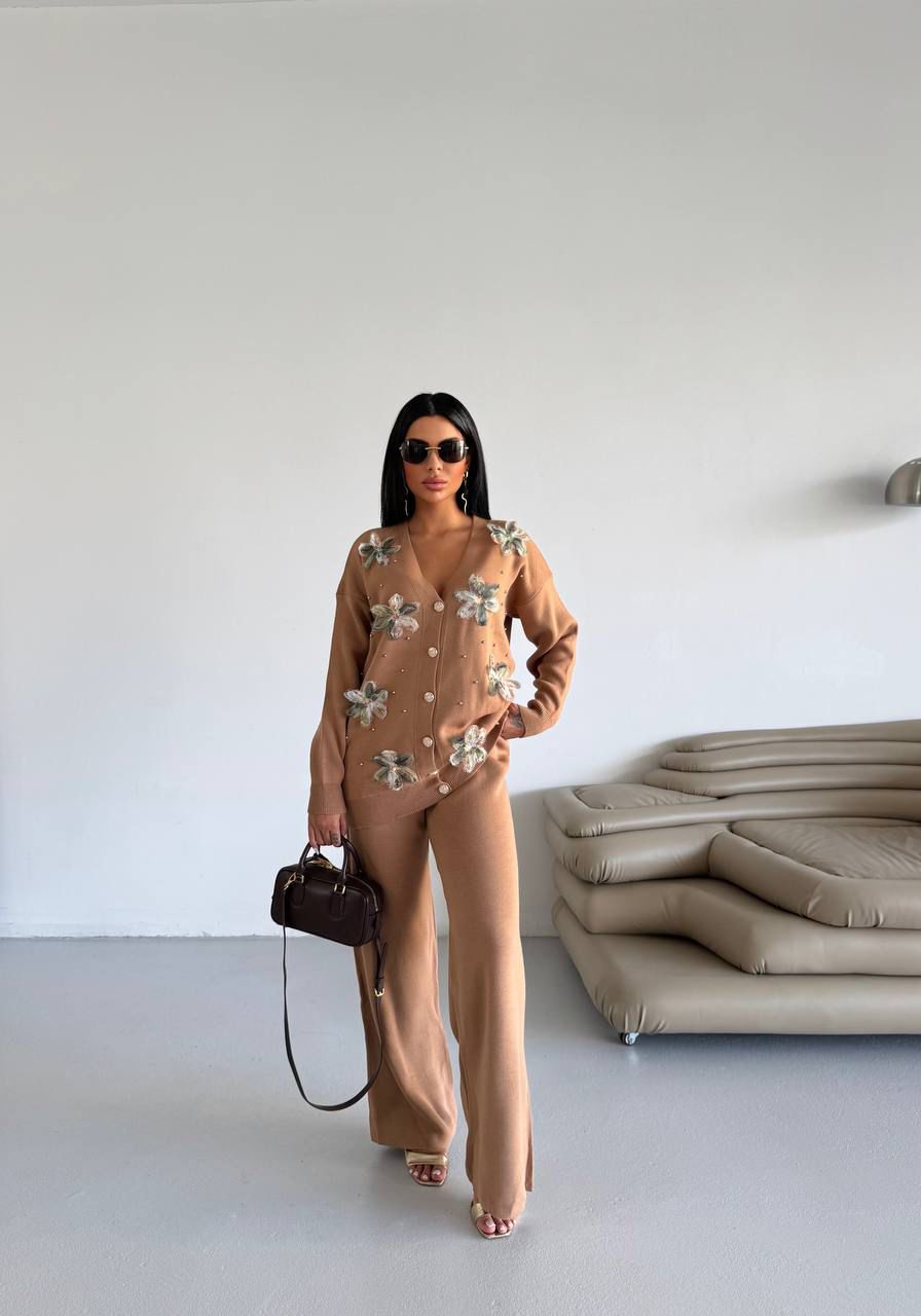 The Caramel Bloom Knit Set blends timeless elegance with artistic detail. Crafted from a luxuriously soft knit fabric, this two-piece ensemble features a button-down cardigan decorated with hand-applied floral embellishments and subtle pearl accents, paired with matching wide-leg pants for a graceful silhouette. Designed for women who appreciate both comfort and couture-inspired touches, it’s perfect for brunches, gatherings, or cozy evenings with style.