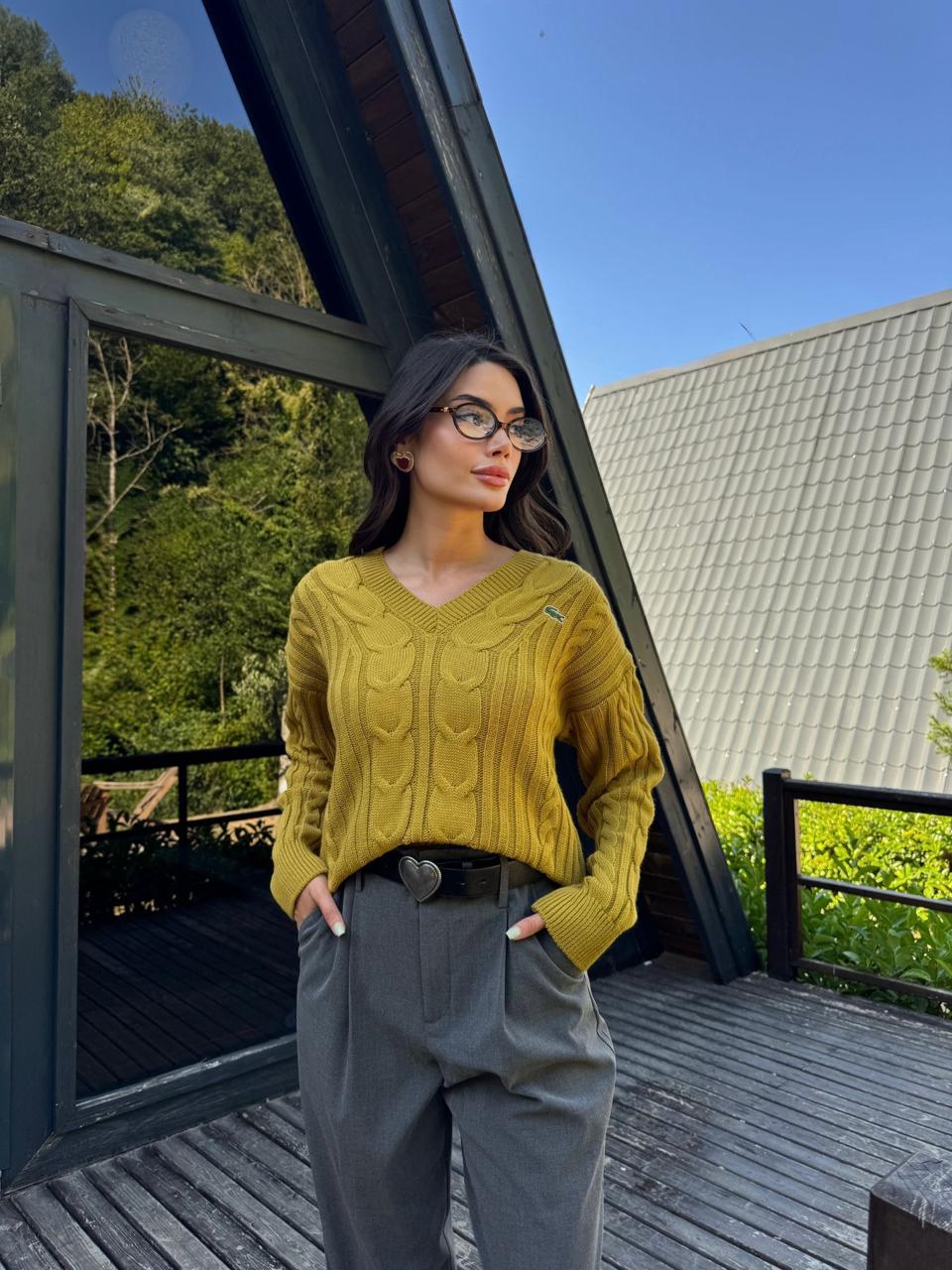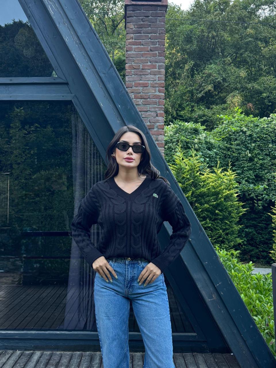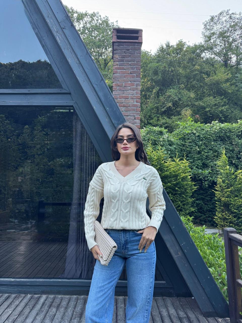 A timeless cable-knit sweater designed with a flattering V-neckline and a beautifully textured pattern. This versatile piece offers a perfect blend of elegance and comfort, making it an essential staple for effortless everyday style.