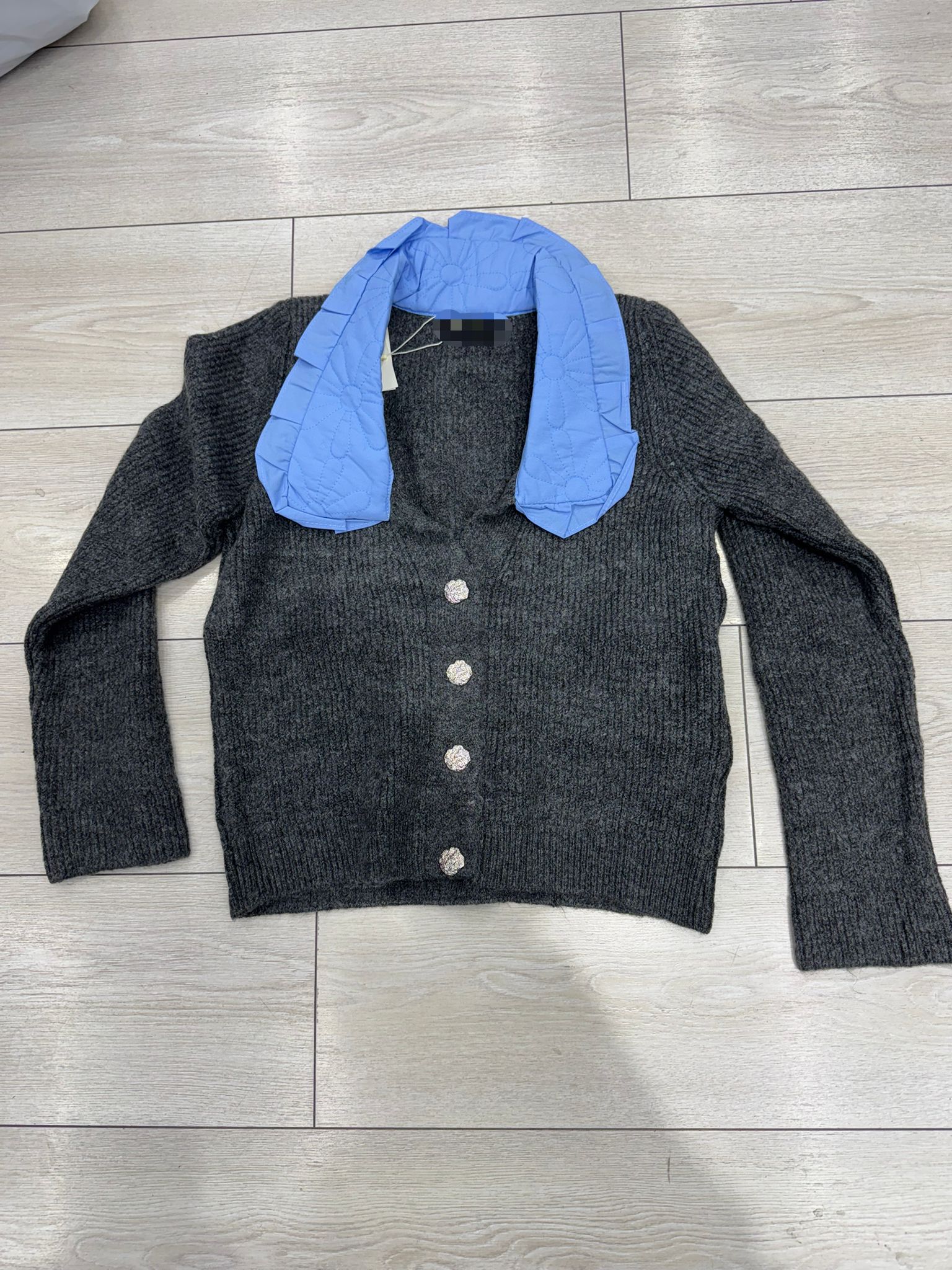 Jeweled floral buttons that add a touch of sparkle and feminine flair.