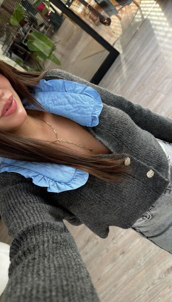A striking mixed-media knit featuring a bold, ruffled statement collar in vibrant cornflower blue. This piece combines cozy texture with high-fashion detailing for a unique, layered look.
