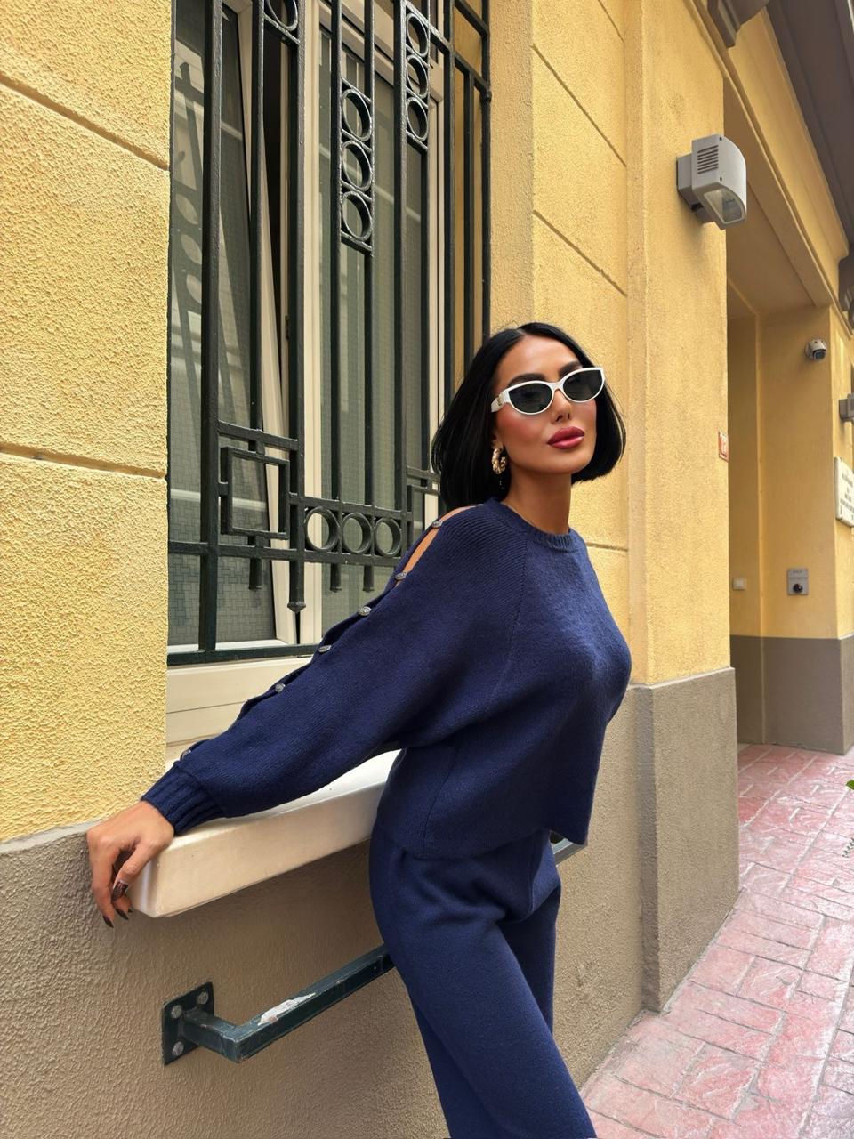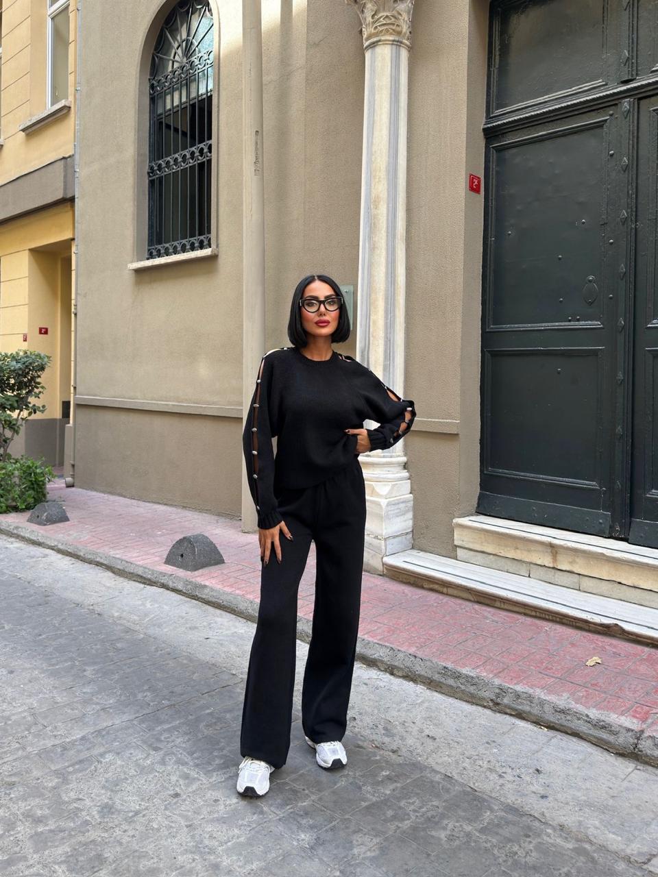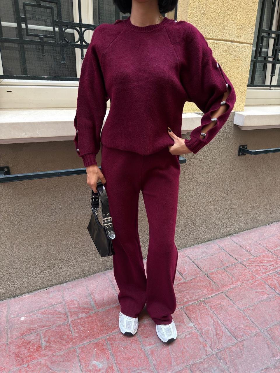 The Cutout Sleeve Set redefines casual elegance with a bold twist. Featuring a relaxed-fit knit top with unique sleeve cutouts secured by button accents, this set brings an effortlessly stylish edge to your wardrobe. Paired with straight-leg knit pants, it offers both comfort and sophistication, making it perfect for day-to-night wear.