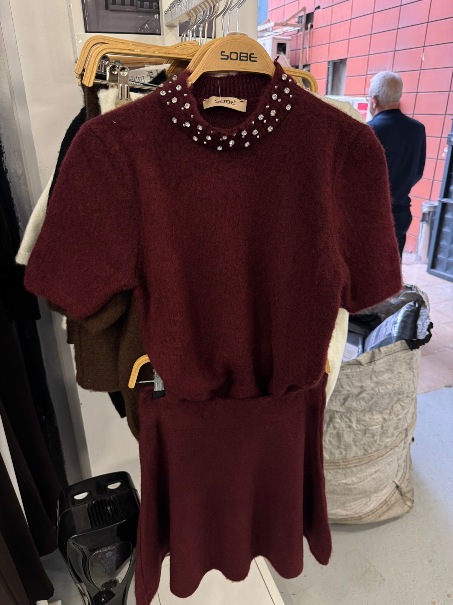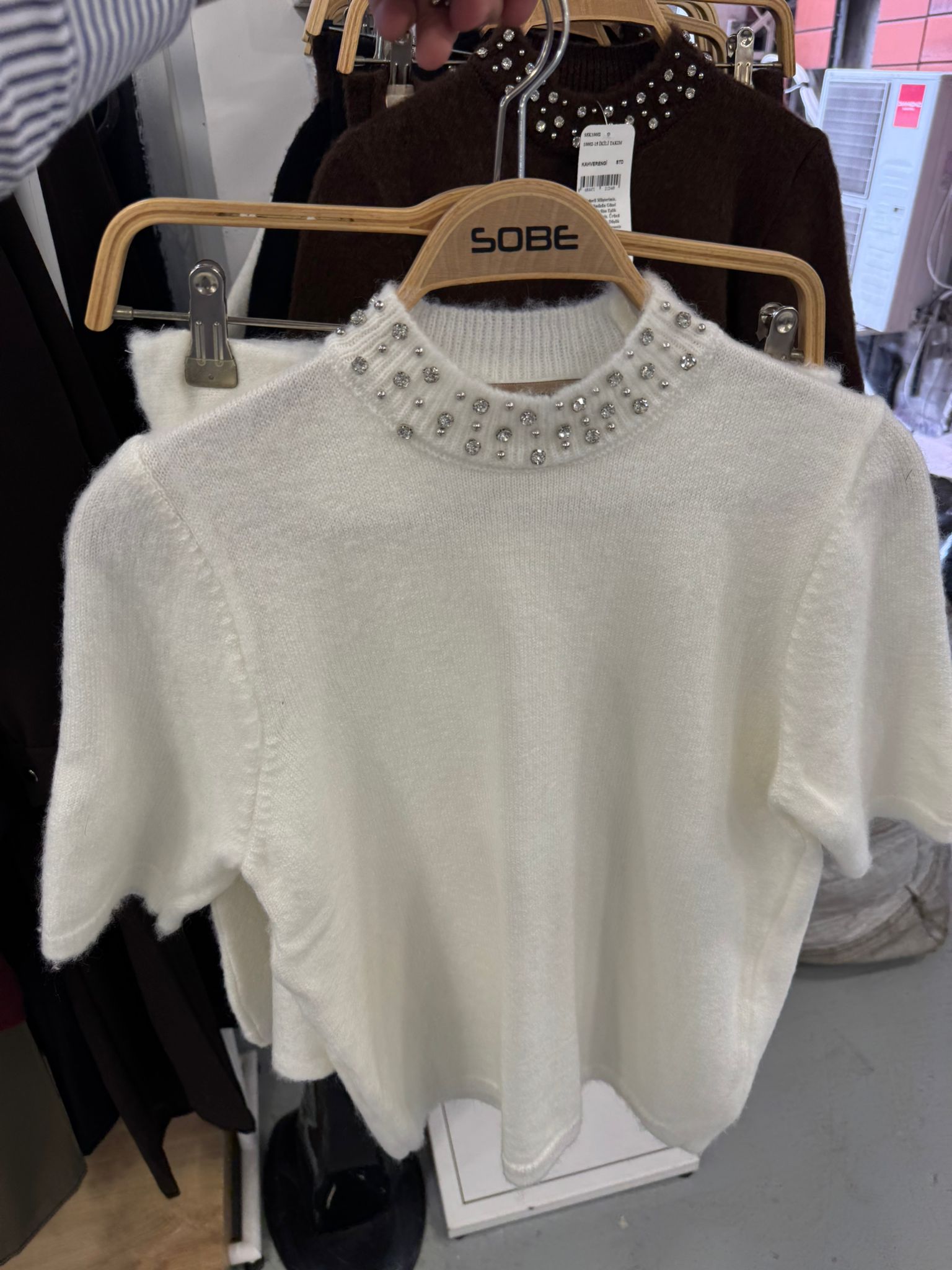 Elevate your everyday look with this luxuriously soft knit sweater, designed with a refined silhouette and a sparkling embellished neckline that adds effortless sophistication to any outfit.