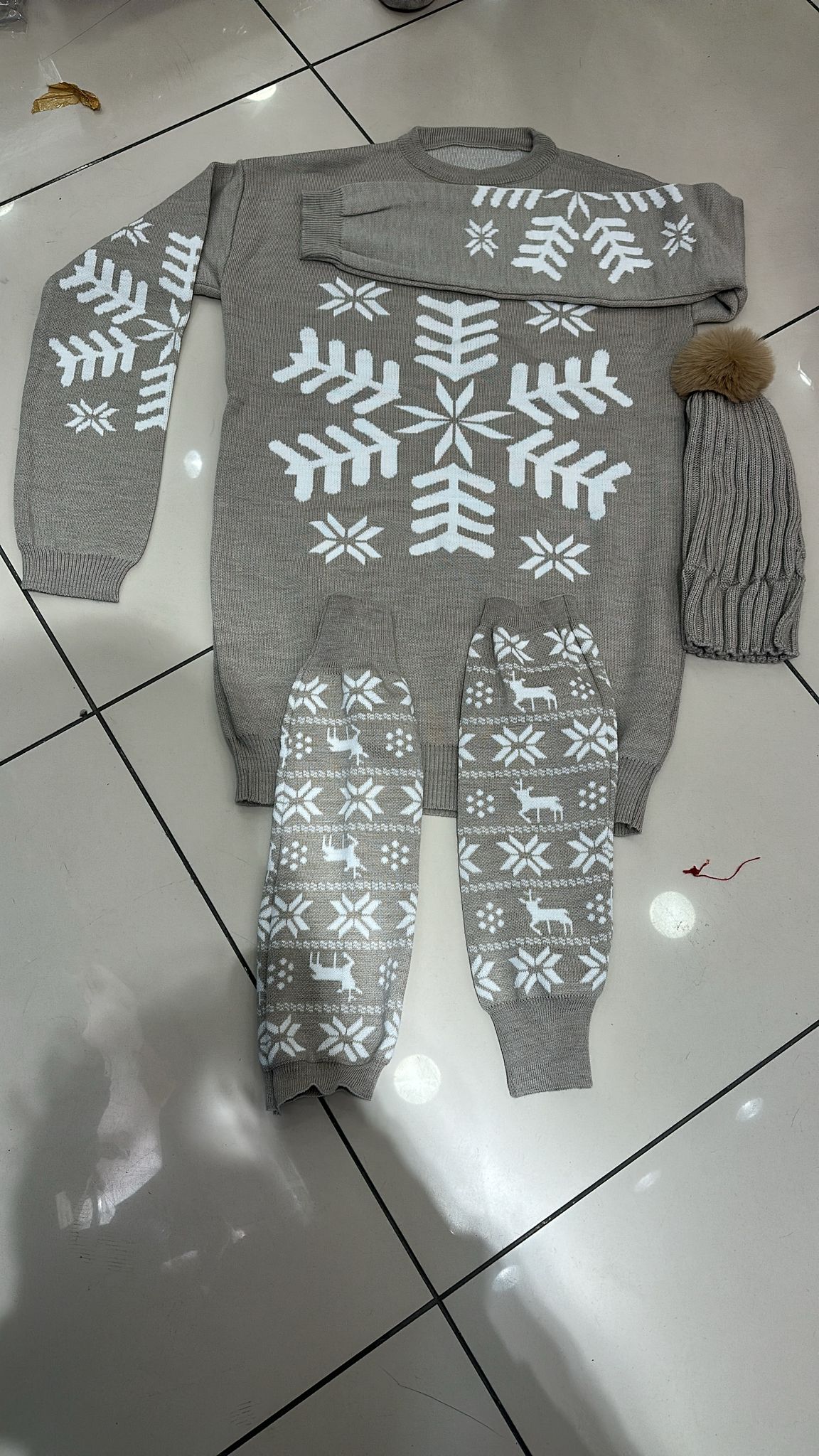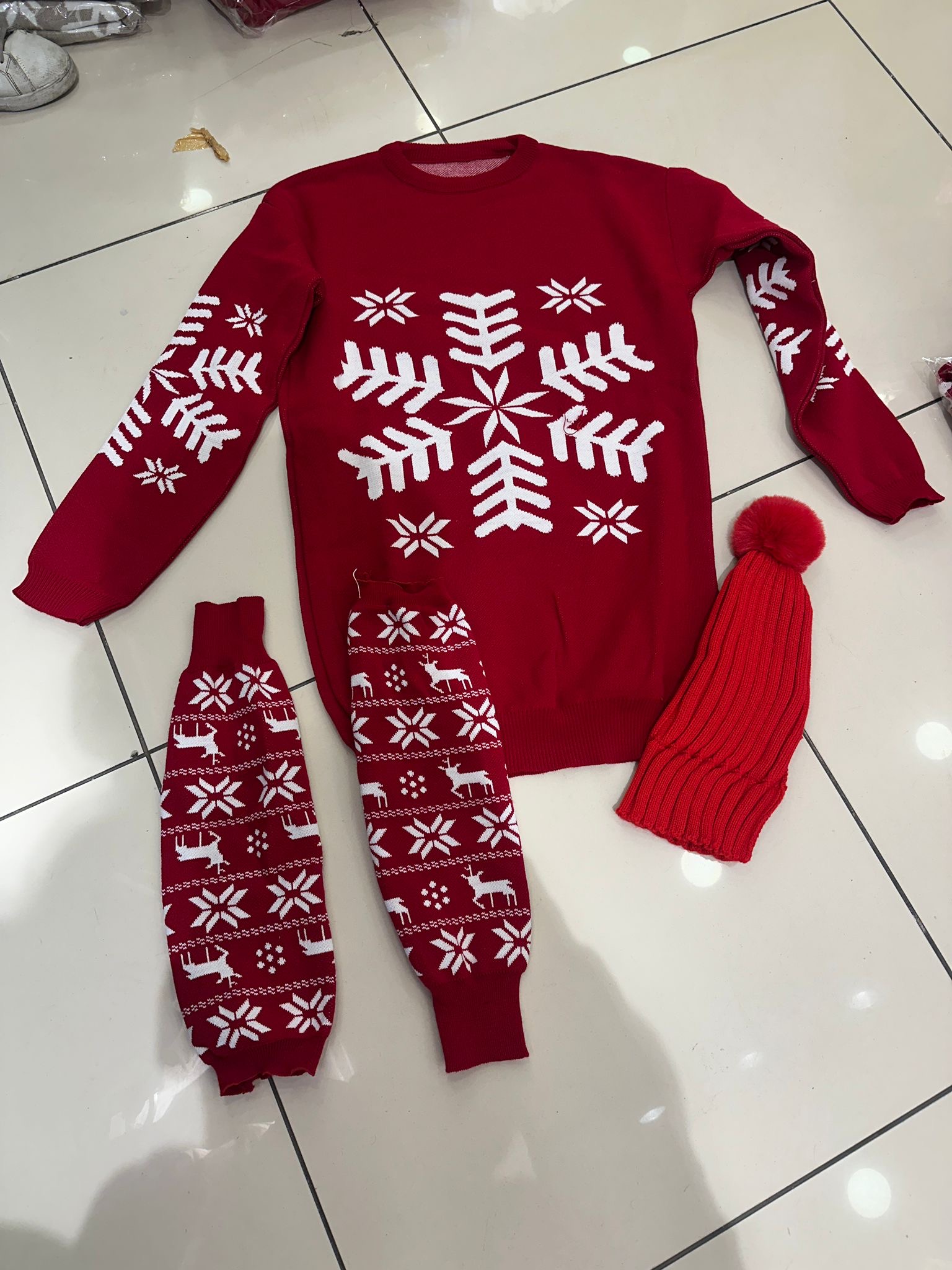 Bring cheerful holiday spirit to your winter wardrobe with this charming 3-piece knit set. Featuring a vibrant red color with classic white snowflake and reindeer patterns, this cozy ensemble is perfect for festive gatherings, winter photoshoots, or simply staying warm in seasonal style. The soft knit fabric ensures comfort, while the matching pieces create a coordinated and adorable holiday look.