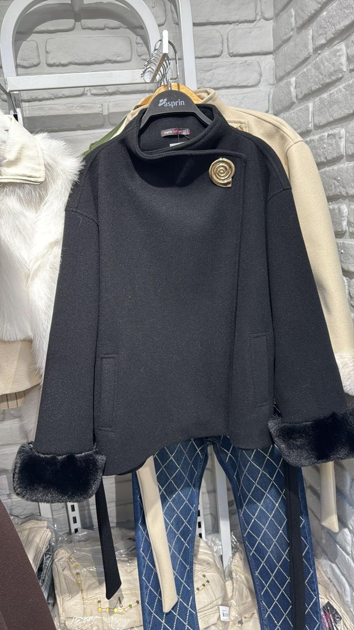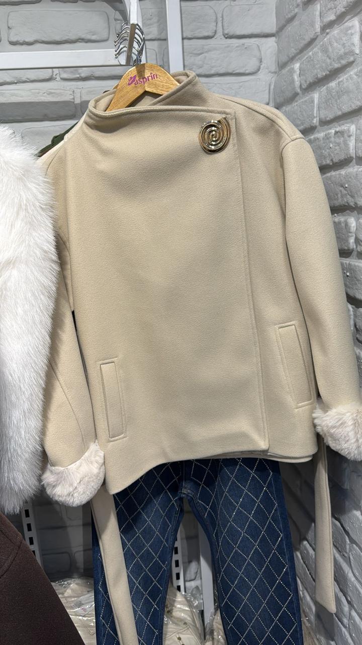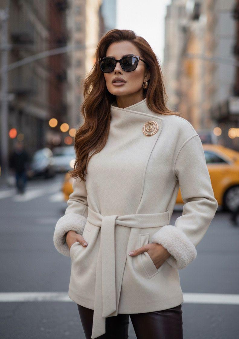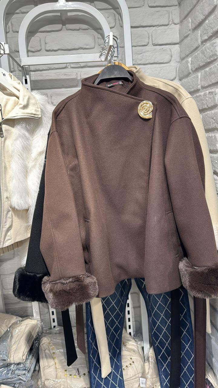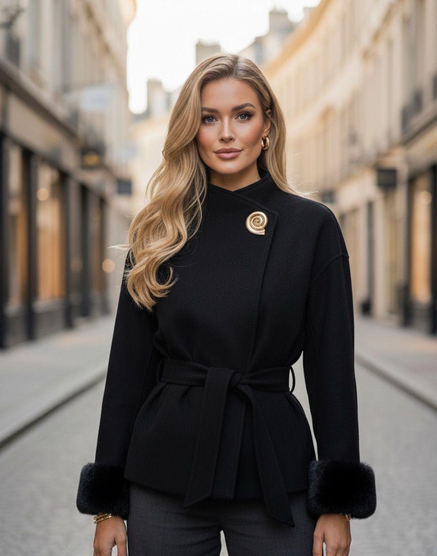 A chic chocolate-brown coat featuring soft fur-trim cuffs, a modern wrap design, and a flattering belted waist. Stylish, warm, and perfect for elevated winter looks.