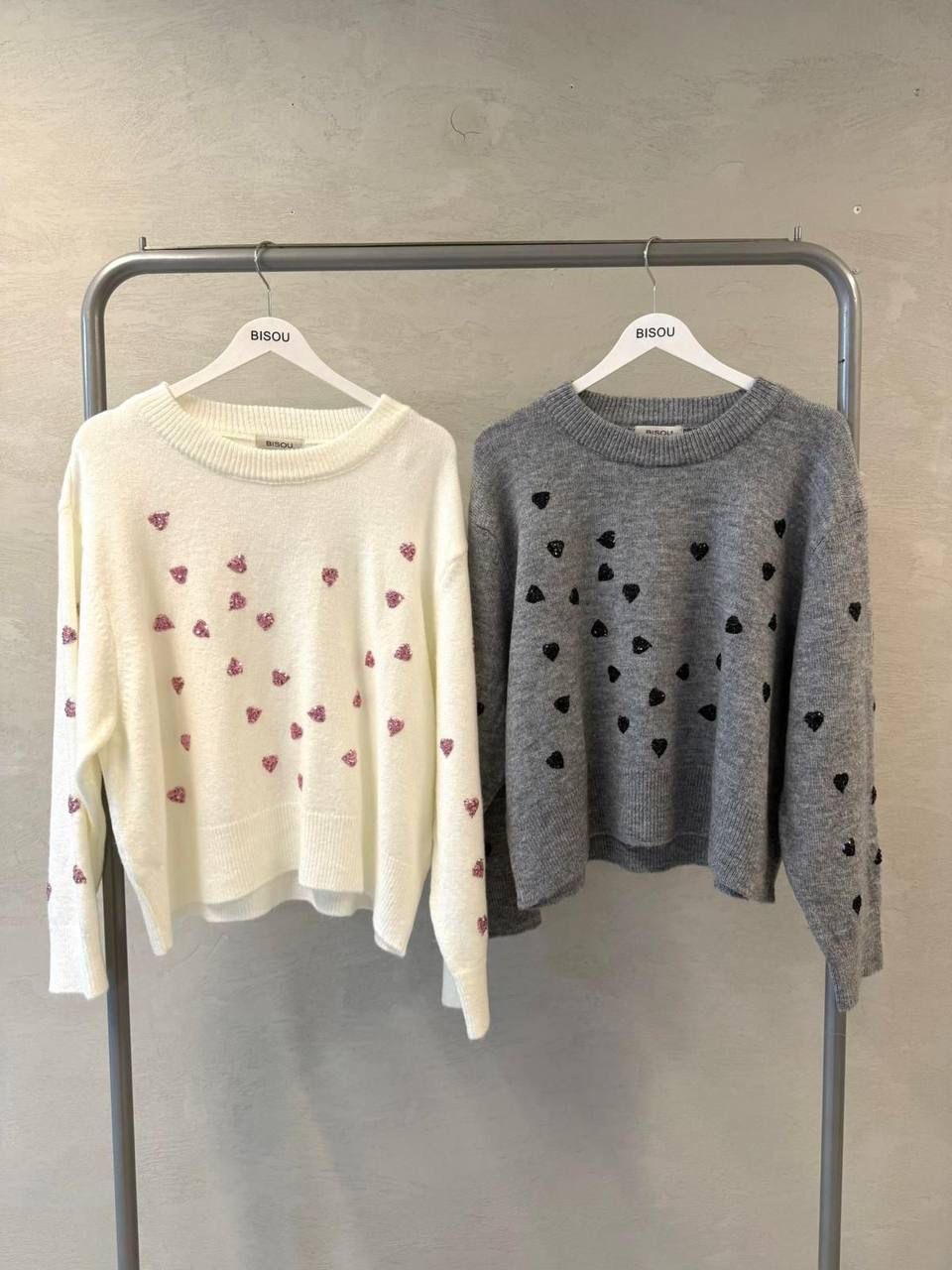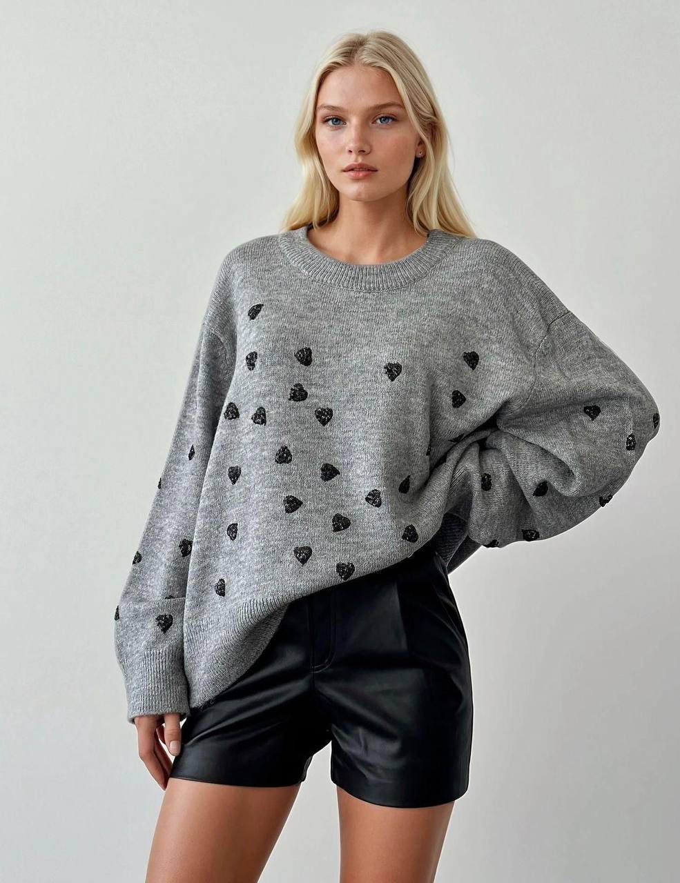 Soft, cozy, and irresistibly charming — the Heart Knit Sweater is designed to bring a playful touch to your everyday style. Crafted from premium knit fabric, it features delicate embroidered heart details across the front and sleeves for a feminine, romantic feel. The relaxed fit and ribbed edges make it as comfortable as it is stylish, perfect for casual days or dressed-up moments.