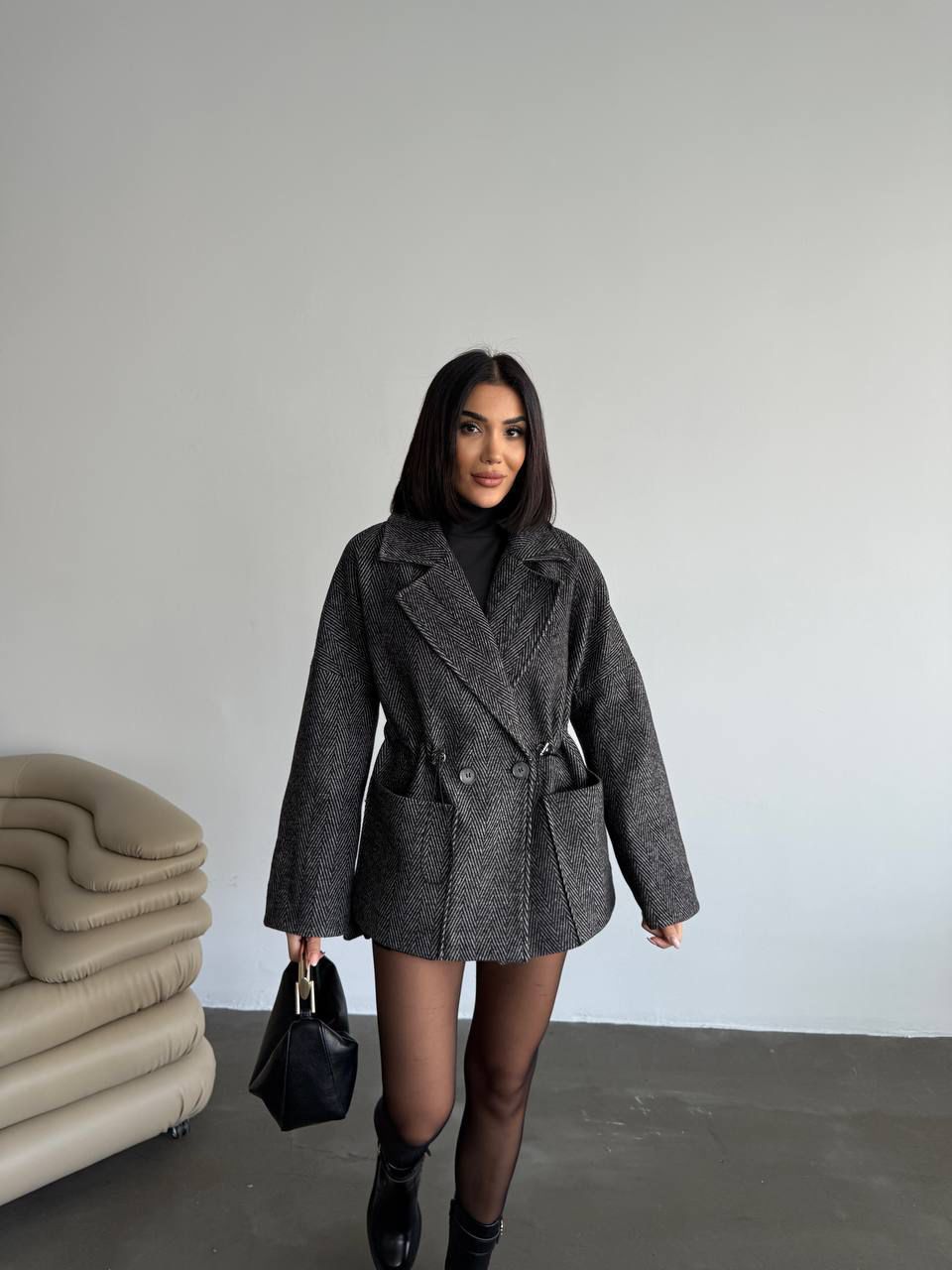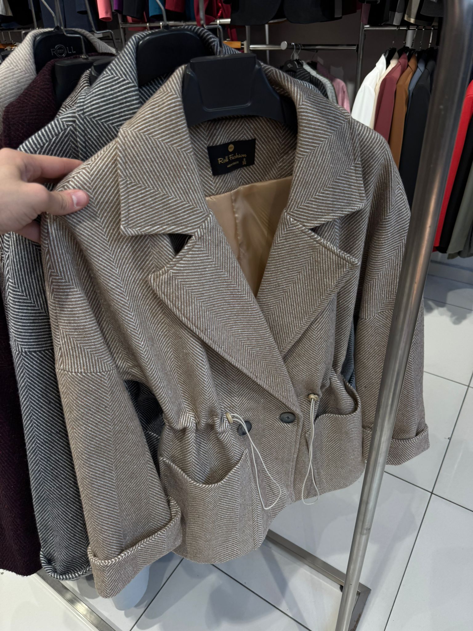 A structured yet relaxed blazer featuring a soft herringbone texture, double-breasted front, and adjustable waist tie — the perfect balance of classic tailoring and modern ease.