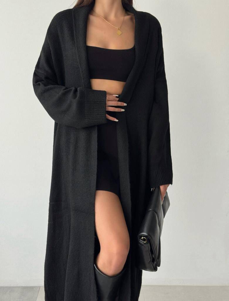 The Midnight Grace Long Knit Cardigan is the ultimate statement of effortless sophistication. Crafted from soft, breathable knit fabric, this longline cardigan drapes beautifully over any outfit — perfect for layering through all seasons.