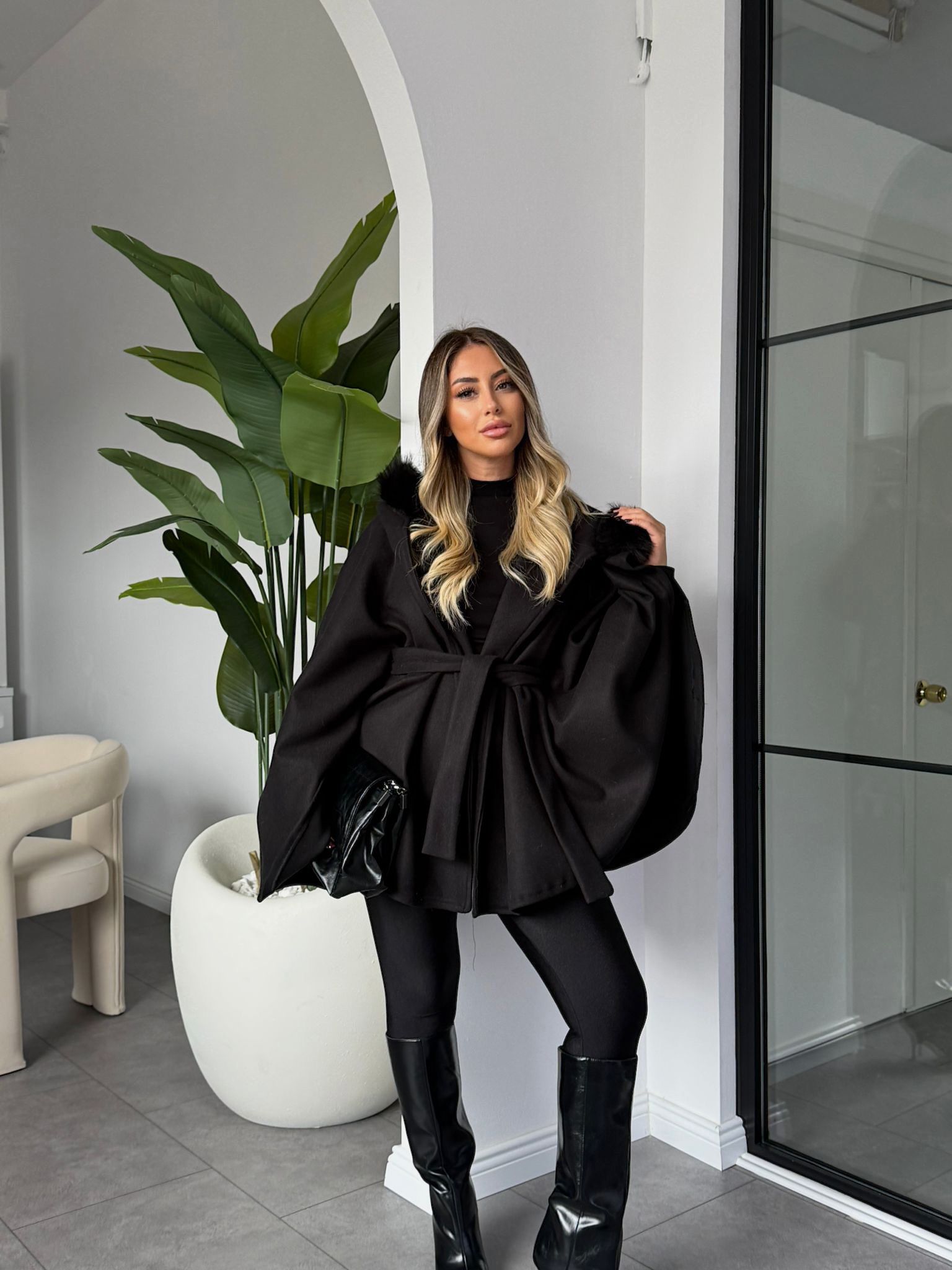 A luxurious belted cape coat with faux-fur trim and wide draped sleeves — a timeless statement of grace and sophistication.
