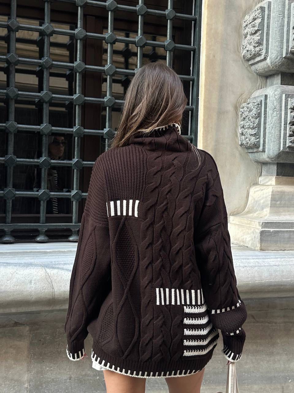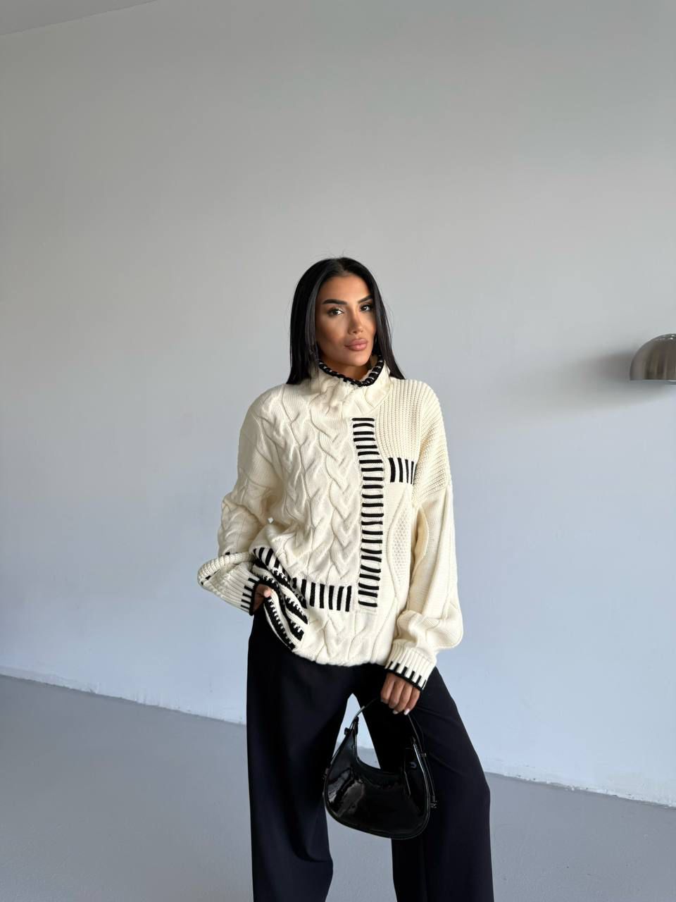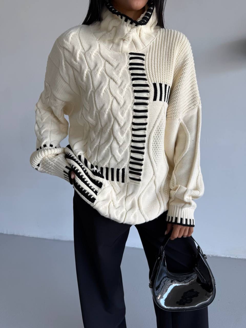 The Monochrome Patch Knit is an artistic rework of classic knitwear. Designed with a mix of cable-knit patterns, oversized textures, and bold monochrome contrast details, it offers both structure and individuality. Its relaxed silhouette and high neckline make it perfect for layering over shirts or styling as a statement piece on its own.