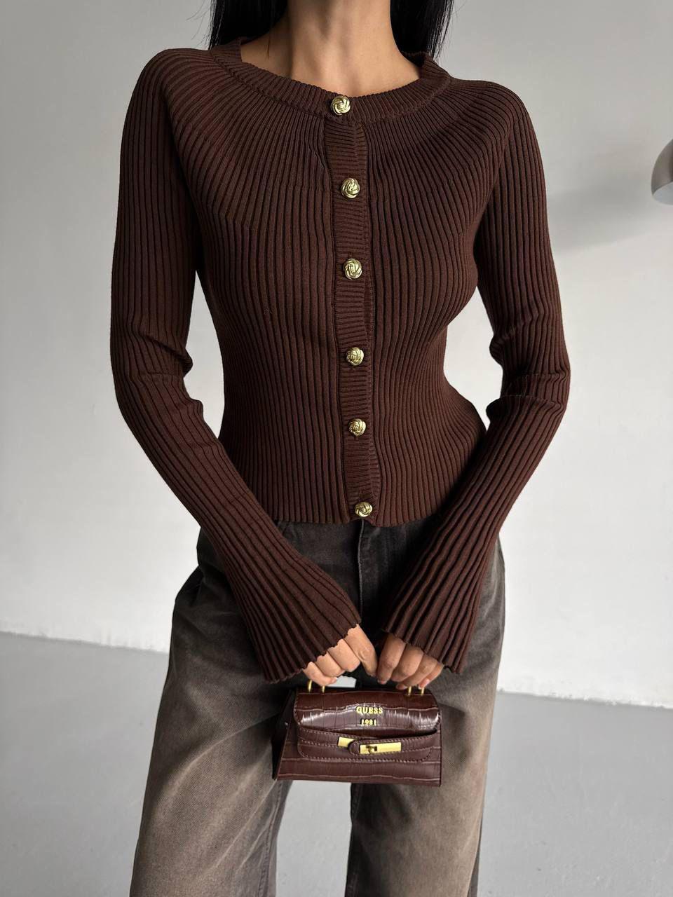 A sleek and feminine ribbed cardigan designed to accentuate the silhouette while adding a touch of sophistication to any outfit. Its sculpting texture and polished button accents make it a versatile piece suited for both casual and elevated looks.