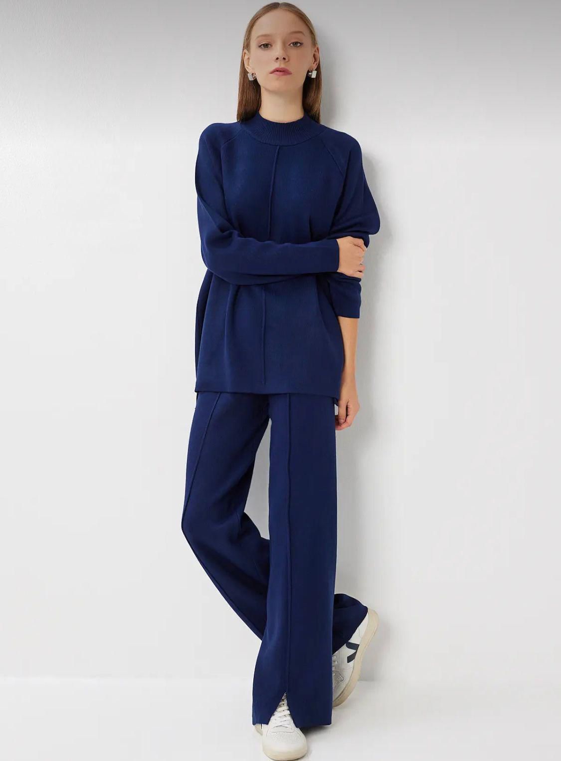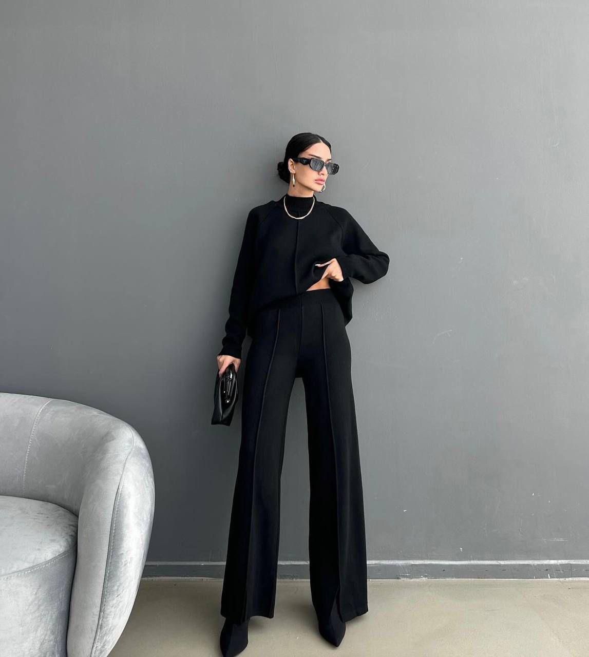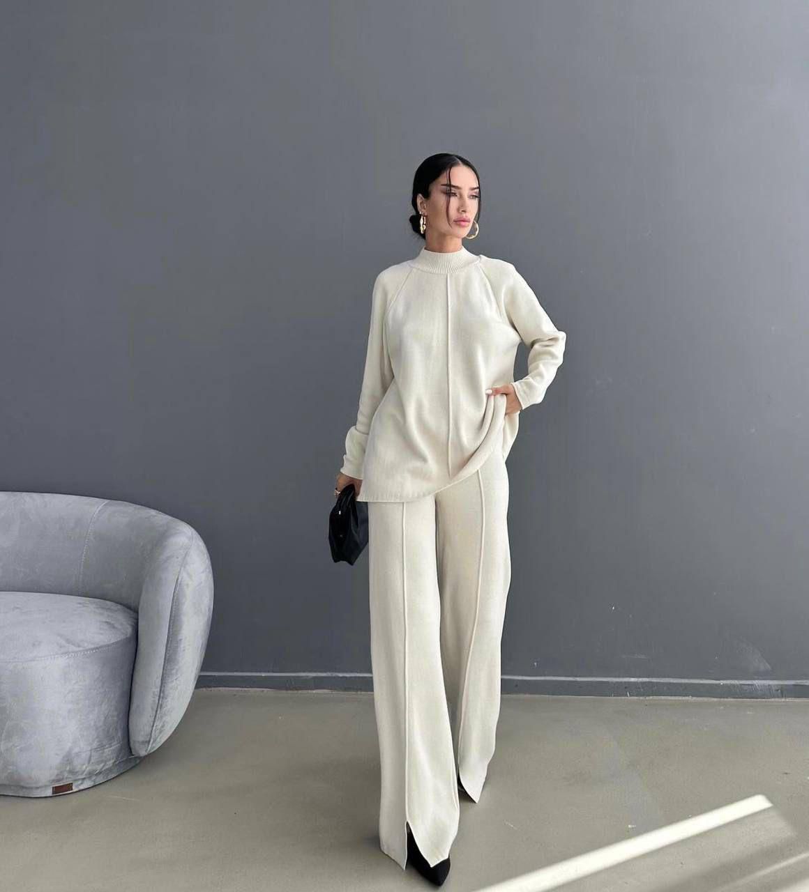 A minimalist three-piece knit set featuring a tank top, wide-leg pants, and a long belt-tie cardigan — the ultimate blend of comfort and quiet luxury.