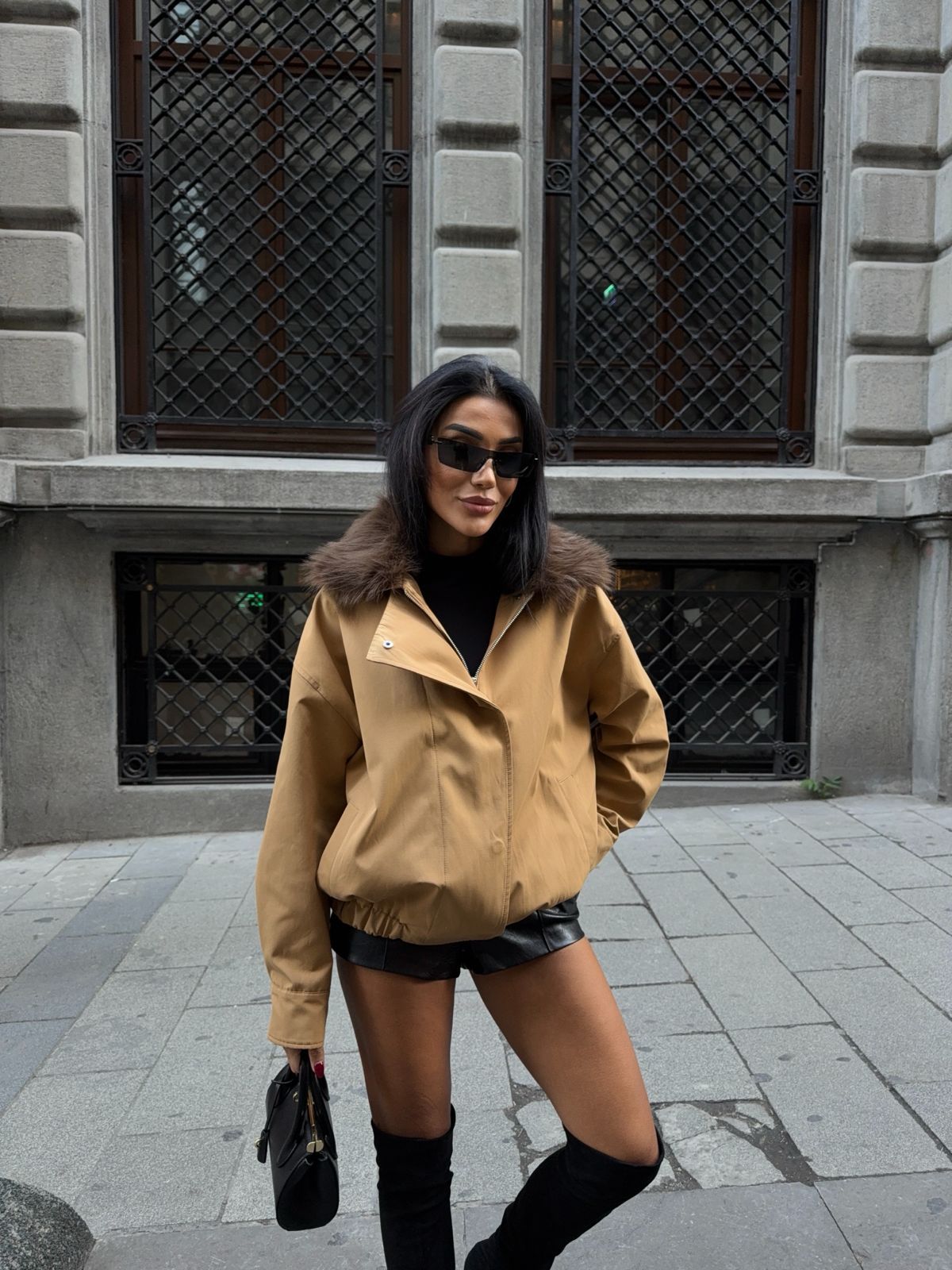 The Sienna Street Jacket captures urban sophistication with a casual edge. Crafted from smooth, structured fabric in a warm caramel tone, this piece features a relaxed cut with a stand collar and subtle snap-button front. Designed for modern layering, it pairs effortlessly with both leather pants and tailored trousers for a sleek, confident look.